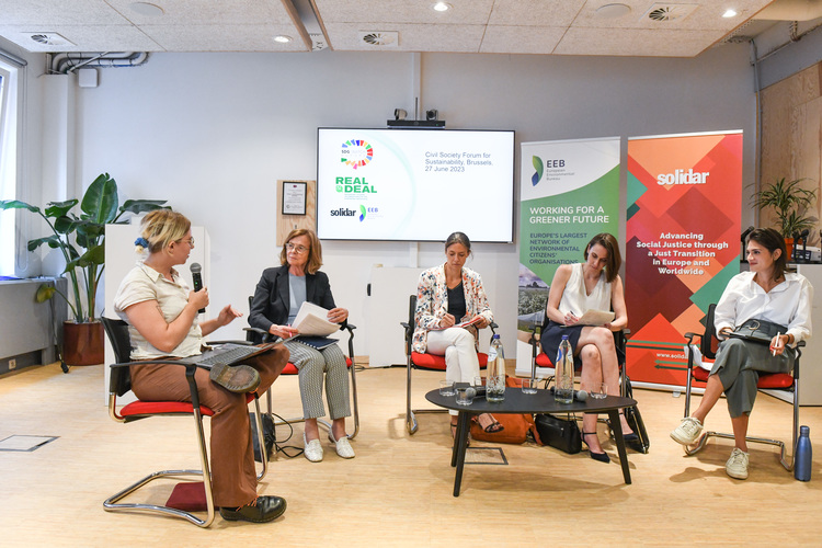 The panel discussion with leading CSO representatives from left to right: Eric Ponthieu, Fair Trade Advocacy Office, Silvia Valentini, CAN Europe, Barbara Caracciolo, SOLIDAR, Adrien Licha, ALDA, and Laura de Bonfils, Social Platform. The panellists shared strategies to ensure that the EGD is more comprehensive, effective, and impactful.