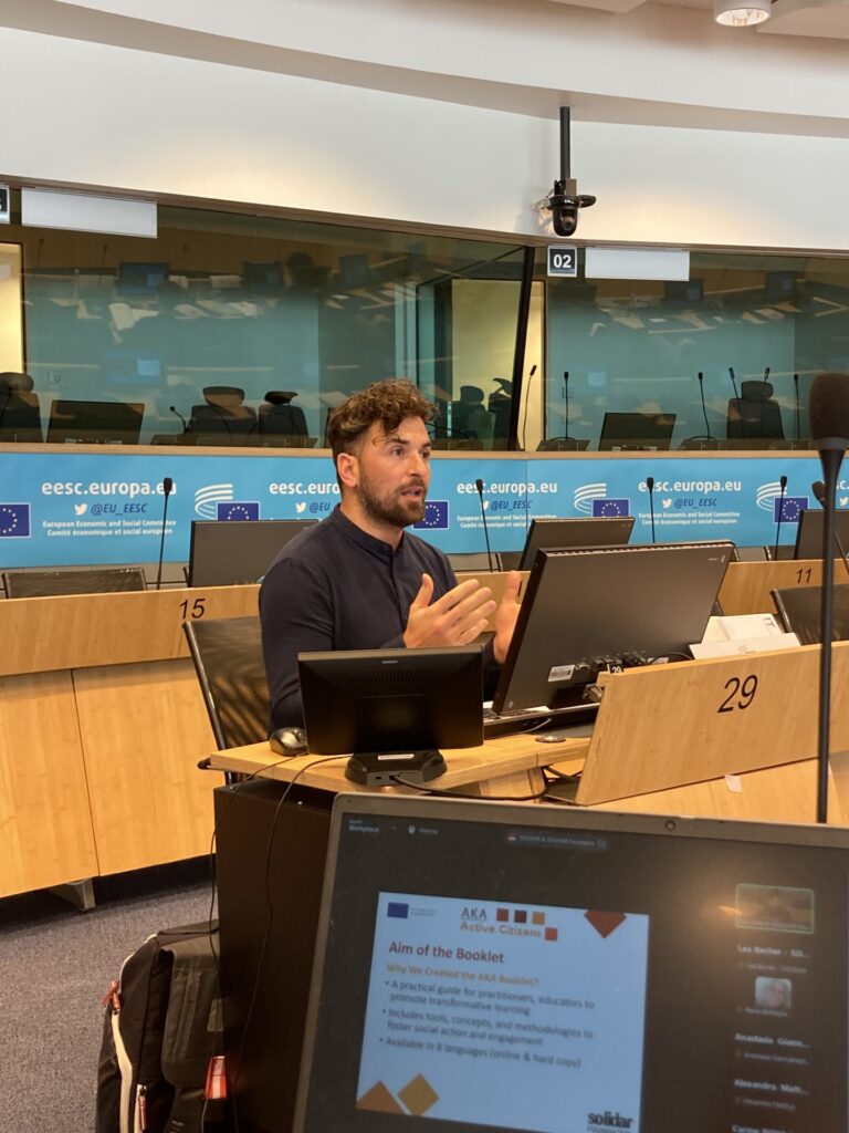 The conference was followed by the launch of the AKA Booklet: Methodologies for Fostering Social Action and Democratic Engagement, presented by Hilmi Tekoglu, Civic Space Policy Officer, SOLIDAR. The booklet serves as a practical tool for partitioners and educators to promote transformative learning by providing accessible and effective methodologies that have been implemented in 8 countries with the aim of empowering young people, particularly from marginalised communities to engage meaningfully in democratic processes.