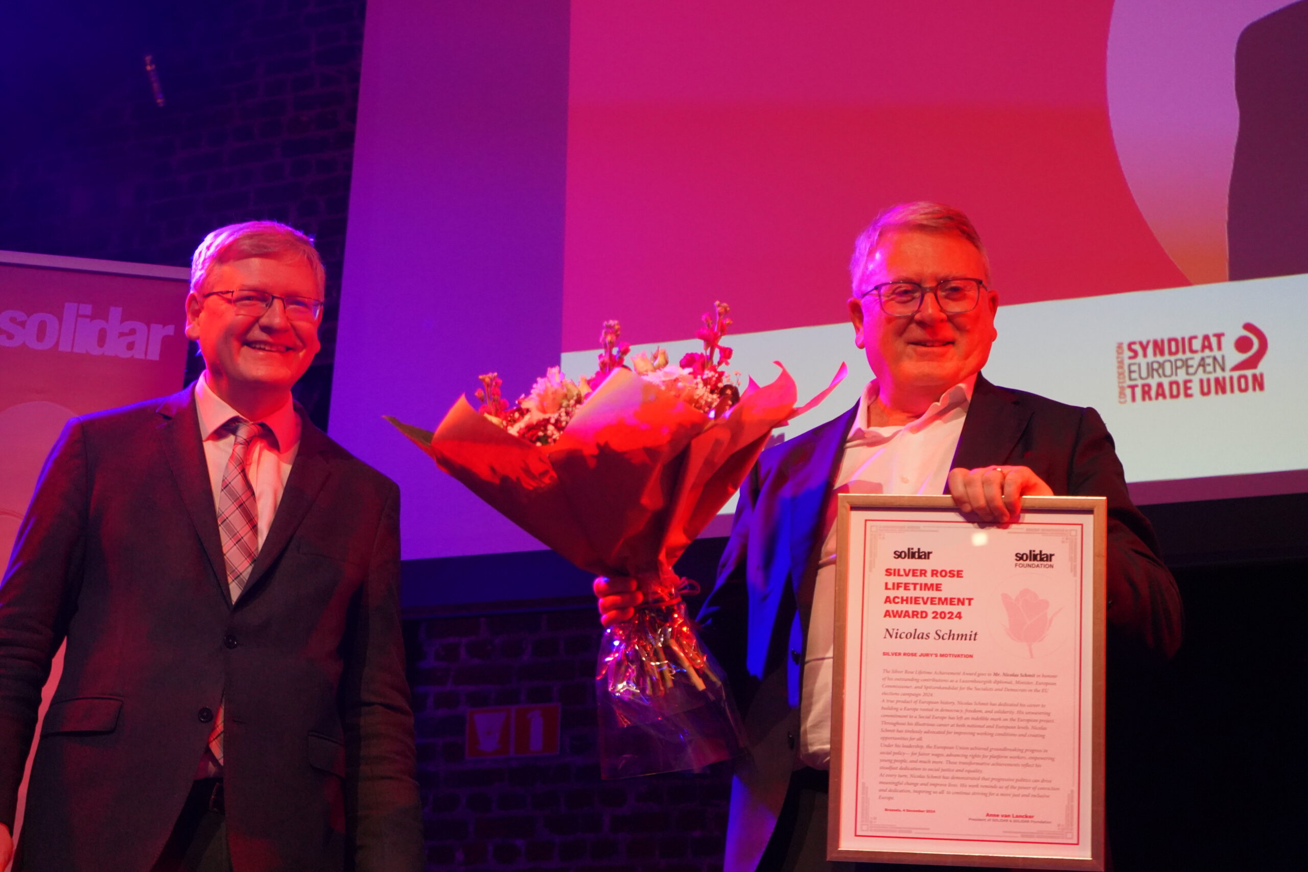 Congratulations to the 2024 Silver Rose Award winners, Women Engage for a Common Future (WECF) for the Just Transition Award, and Nicolas Schmit for the Lifetime Achievement Award. This year, we introduced a new award, the Legacy Prize for Social Justice, awarded posthumously to Glenys Kinnock to honour her lifelong commitment and dedication to social justice internationally.