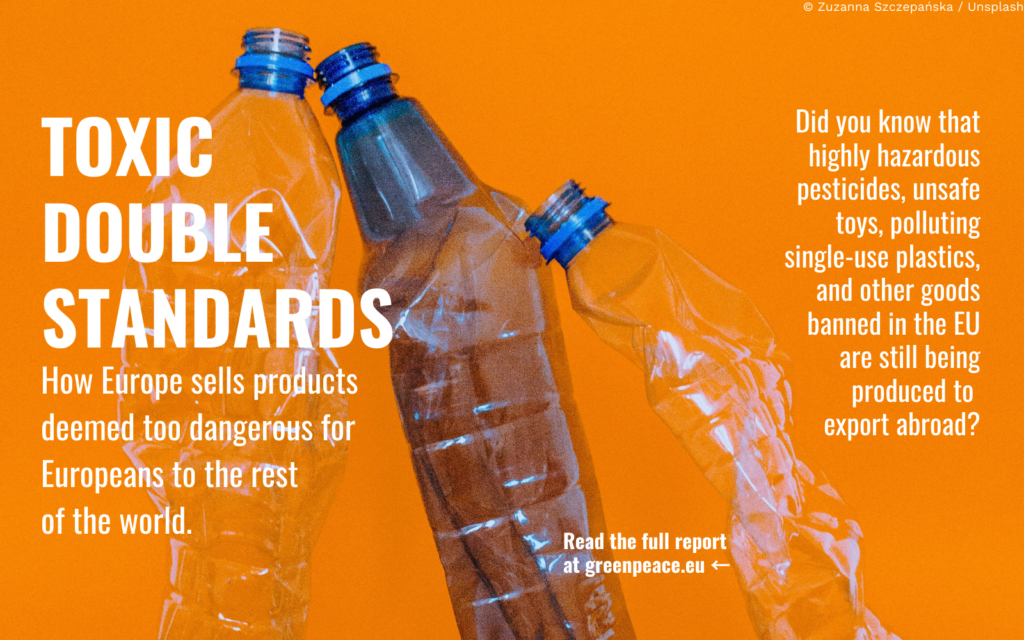 Greenpeace EU campaigner Lis Cunha said: “It’s scandalous that EU bans on dangerous products don’t apply when the goods are destined for non-EU countries. From plastics to pesticides, Europe’s politicians know that these products are harmful to the environment and people’s health, but they’ve chosen to put private profit above the well-being of vulnerable communities in other parts of the world. It’s indefensible, and the EU must now act quickly to close these loopholes with a single, cross-cutting law.”
